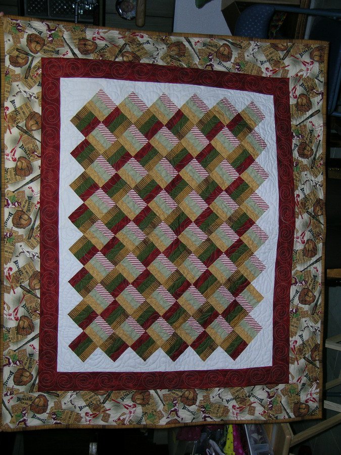 silverquilter450 Take Me Out to the Ballgame - Baseball fabric became the border of thihs quilt. The pattern of the quilt two different values of things you'd find in a baseball park---grass, bricks and bats.