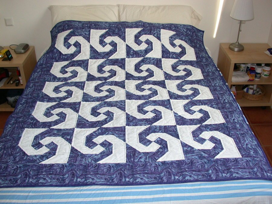| Design Source - Description | The marbelized blue fabric makes this quilt move! The pattern is an interpretation by Maruszka Hufstader of the Monkey Wrench pattern |
