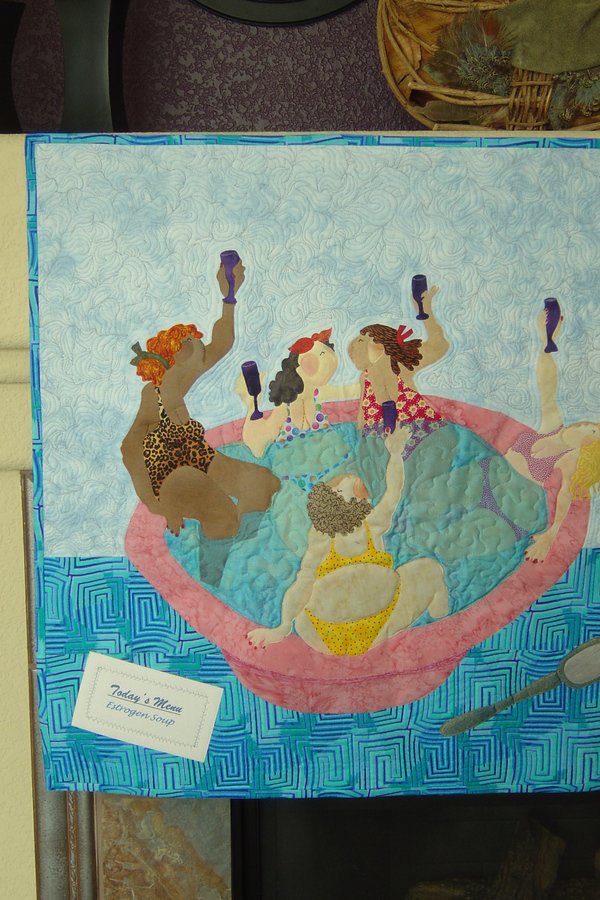 sharonquilts In The Soup - This quilt was made for the 2005 Alpine Quilters challenge - "Estrogen." The menu card on the table by the bowl and spoon reads: "Today's Menu: Estrogen Soup."