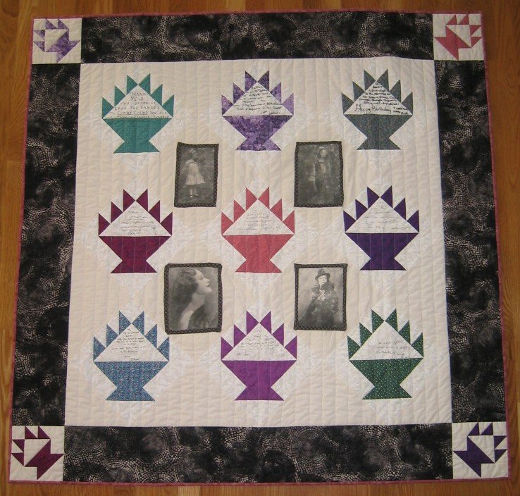 | Design Source - Description | Made for Mother's 90th birthday with signature blocks (4 children/5 grandsons) a quilter's dream number. 4 picture blocks (ages 5, 13, 25, 31) and a song completed the celebration. |