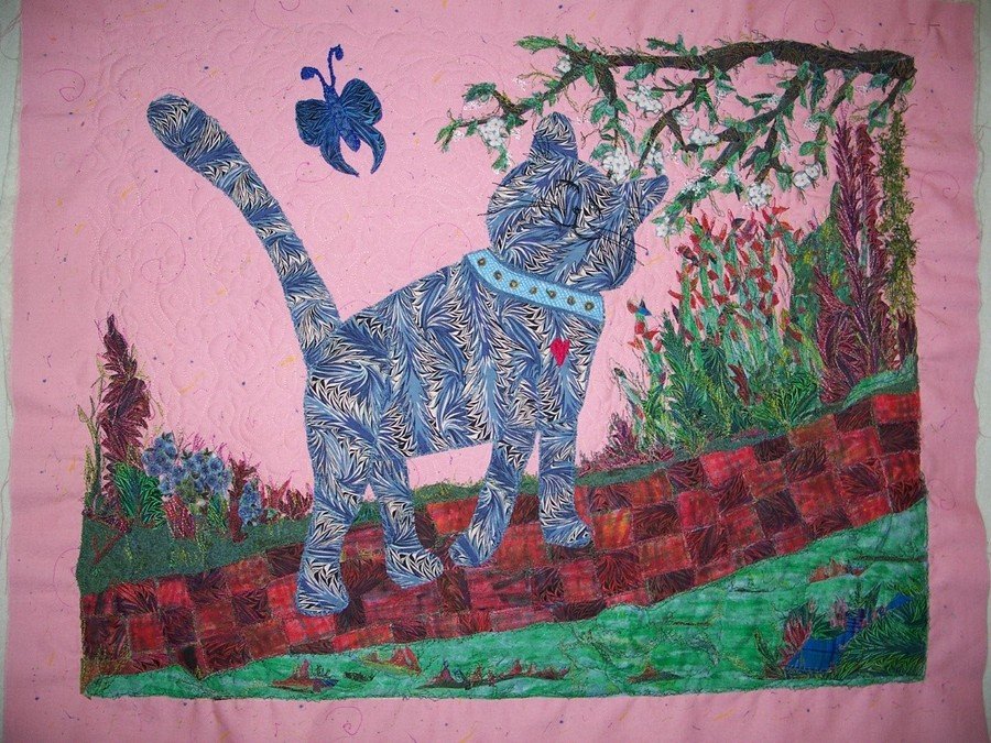 QuiltPromoter Kitty In The Garden - This is part of a Merry-Go-Round Challenge with my guild. Each of us received 8 blue fabrics in various sizes and were challenged to make a quilted item using at least a part of the 8 fabrics. This is one side of what will be a tote for my cutting mat, etc. I added the pink background fabric, but all of the appliques were challenge fabrics - albeit painted or inked to give me some variety.