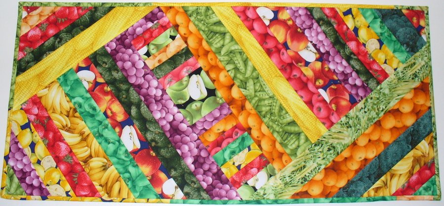 | Design Source - Description | Our guild had a workshop for this table runner. I had fruit and vegitable fabric with idea how to use. So I thought, why not! Bright and Happy... |