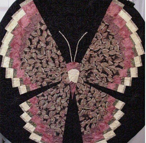 | Design Source - Description | Large butterfly made with Hoffman's challenge fabric 2001 on a black background. Applicated drunkards path blocks make body of butterfly. Quilter with metalic varigated thread. |