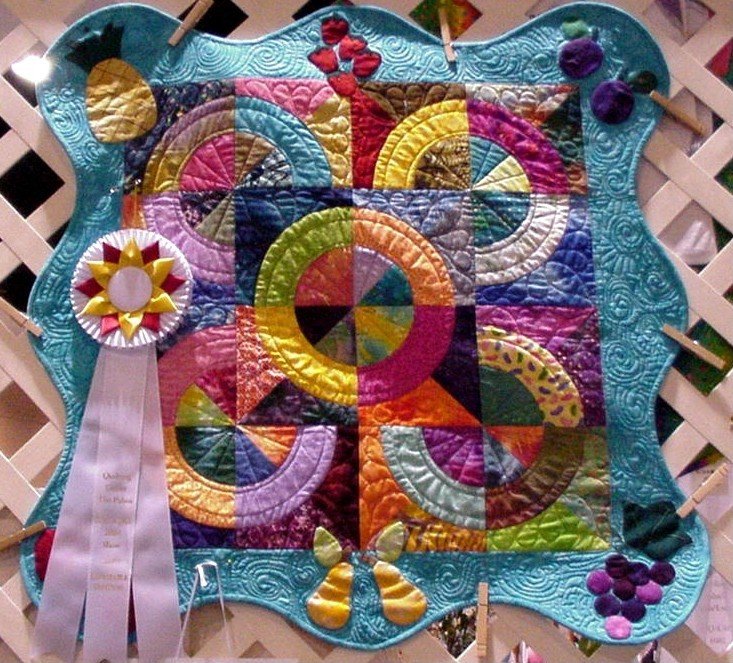 | Design Source - Description | Guild challenge using five of their selected colors and a theme of fruit loops. I added the appliqued fruit. |
