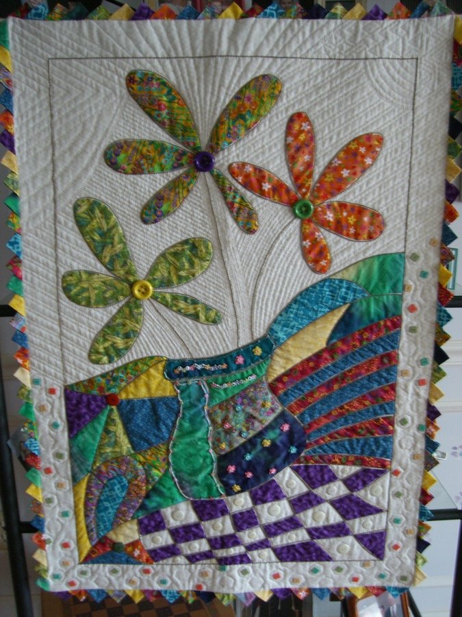 bodaquilts Flower Power - I hand draw Artist Trading Cards (ATC's) and I used one of my cards as the inspiration for this quilt. This was a guild challenge. We each selected one fabric and cut it into 12 fat quarters. We had to use all of the 12 plus we could add one fabric. It was lots of fun and I won the challenge.