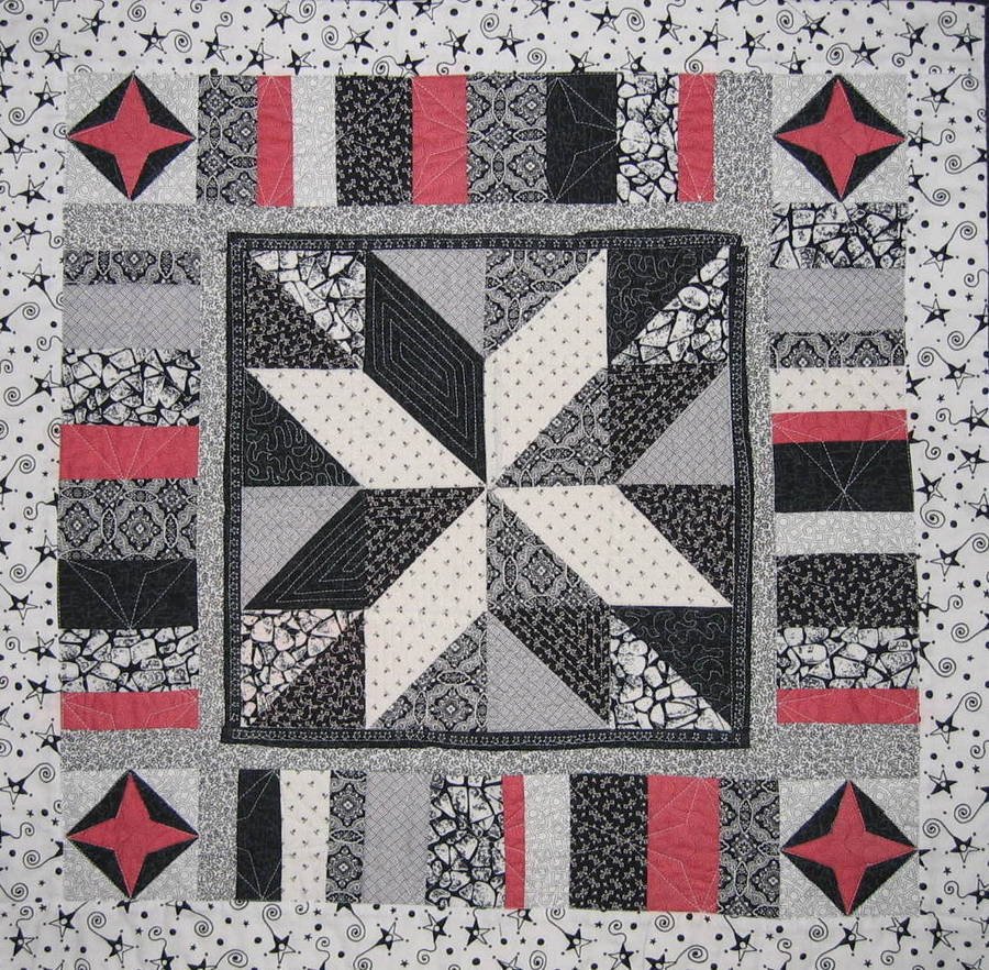 queenjude Stars and Bars - Challenge quilt, had to be black and white with another color. I started the center years ago to make a black and white quilt and made the center, while taking an online quilt class on borders. Never finished the class or the quilt. Now it will be done!