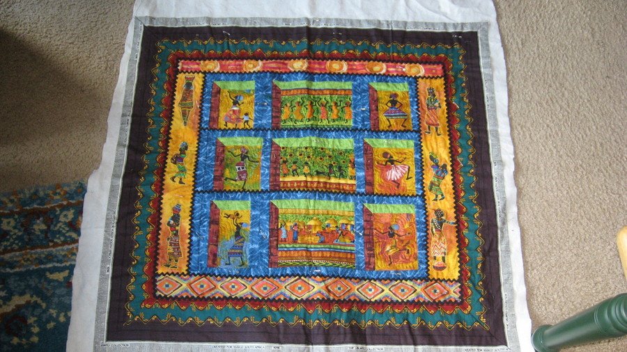 smoses After spending a month traveling in Ghana I found these great fabrics from Julia Cairns, which perfectly expressed my own memories of this wonderful country and it's beautiful people. The outer border is made from fabric purchased in Africa. I have it pin basted and started the quilting. It's next on the pile of UFO's to FINISH!!