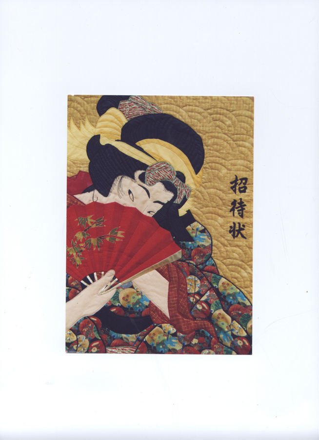 MaggieMac Invitation - Hoffman challenge fabrics. Appliqué, hand and machine quilted, free machine embroidery. Painted decoration on fan.