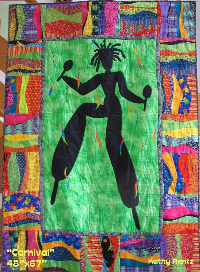 karentz Carnival - I lived on the Virgin Islands for awhile and enjoyed Carnival each year. The dancing is lead by the Macko Jumbies and I wanted to remember the good fun feelings of Carnival with my own Macko Jumbie. The quilt was started in 1999 when I learned curved piecing but I put off drawing the Macko Jumbie for a few years.