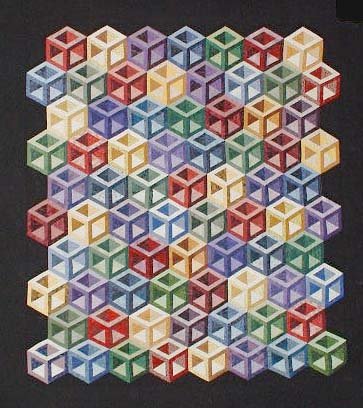 LindaJulia Hollow Cubes - I have a fascination with 3 dimensional looking quilts, and this one was great fun to make! I free motion quilted a different animal in each of the hollow cube blocks. I used Laura Lee Fritz's book as inspiration and without marking, I just had fun 'drawing' with thread.