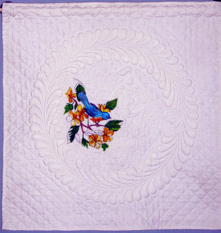 ritzy Wholecloth Bluebirds - I loved the greeting card and thought it would make a good quilt. The bluebirds and flowers are handpainted. I used trapunto in the hand quilting. The back also has a flower painted on to cover a spot of blood. It won a first place ribbon in the Fine Arts category at a local county fair.