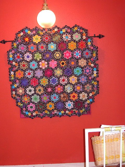Houstonjudy intuition - Variation on Grandmother's Garden. Hexagons in the rings of 6 are fussy cut to be identical, or in somecases, very closely related. The black and white portions are quilted in white thread and the colored portions in thread that matches as close as possible. The pink corners poking out at the bottom are actually from the quilt below it...oops