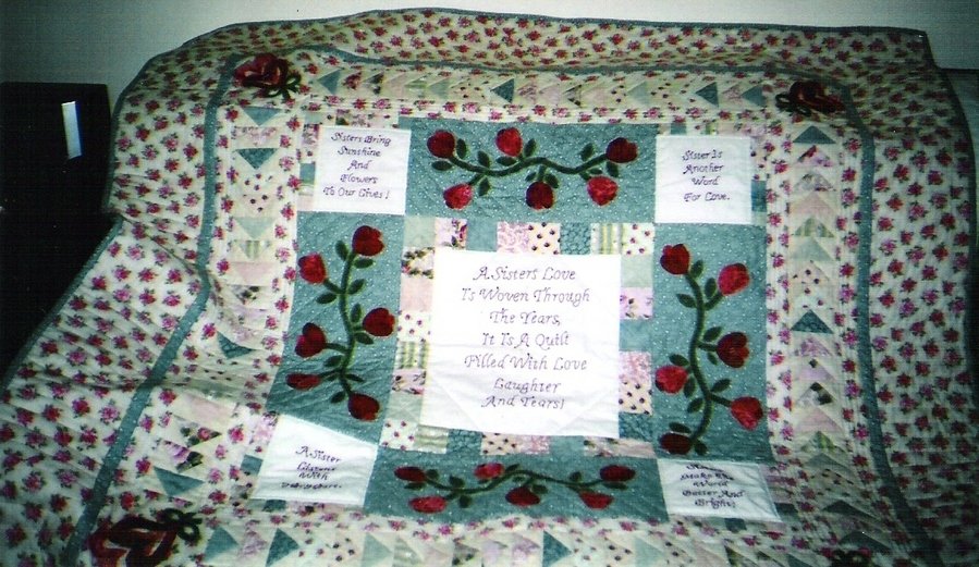 quilting101 Sisterly Love - Made for my gorgeous little sister's 40th birthday. i enjoyed making this quilt because it had a number of different techniques. I enjoyed even more seeing my sisters delighted face whwen i gave it to her.