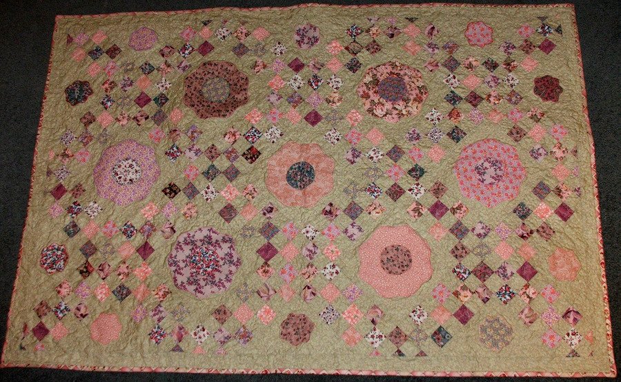 | Design Source - Description | Irish Chain (instructions found on internet) with hand appliqued flowers from a pattern in Australian Patchwork and Quilting magazine. Free motion quilted. |
