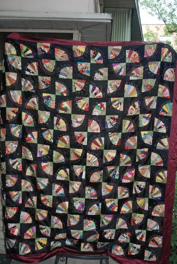 Ron114 Charlott's Grandmother's Quilt Number 1 - When my dear neighbor Charlott died in March 2007 at the age of 75, she left me this wonderful silk and satin quilt in the fan block pattern, I think. It was made by her grandmother, probably in the early 1930s. We miss you Charlott.