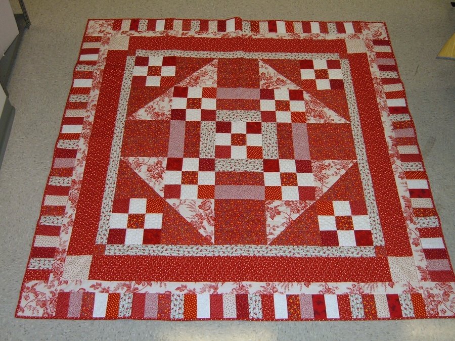 dchris174 From Auntie D - There are two of these quilts - this one in red and white and a matching one in blue and yellow to please two special young ladies. This one got dragged to show and tell in my "niece's" school after Christmas.