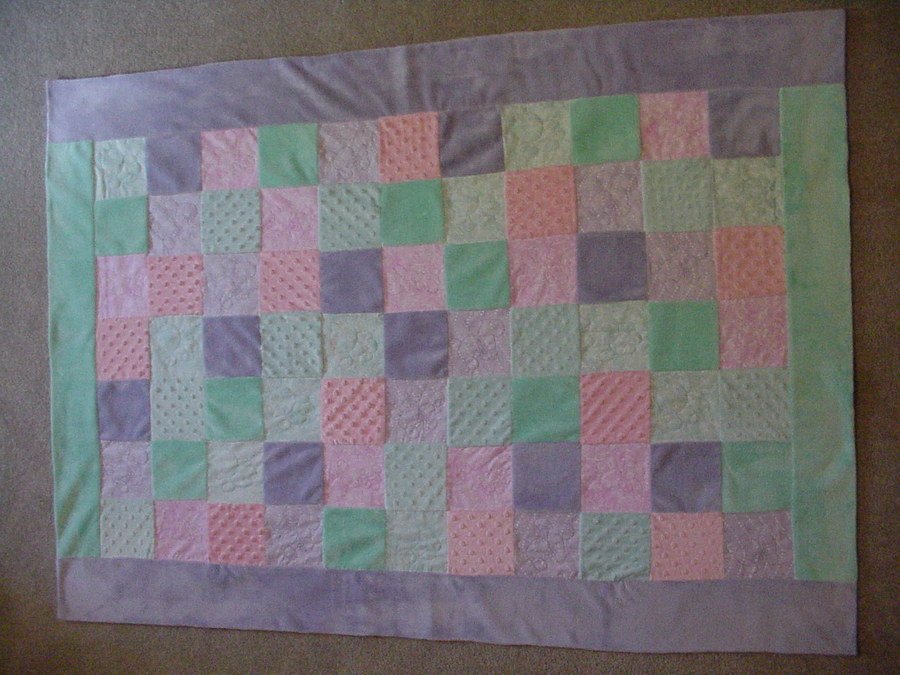 | Design Source - Description | Minkee fabric alternated with cotton prints. Backed with flannel. Quilted with puppies, kittens and bunnies. |