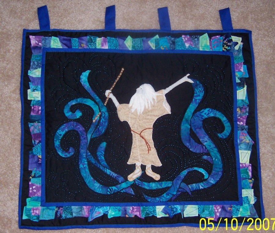 | Design Source - Description | This is a handquilted, depiction of Moses parting the waters. The border is as seen on one of Alex's shows...only I cut the squares in half to create a flat side to the border before applique. |