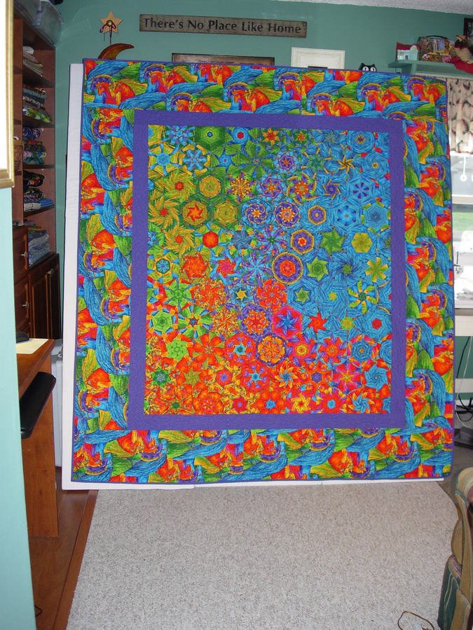 | Design Source - Description | One Fabric, cut 6 repeats, align, cut into strips, then equilateral triangles. Sew Hexagons, sort by color, design. I have made 16 of these and taught 10 classes. |