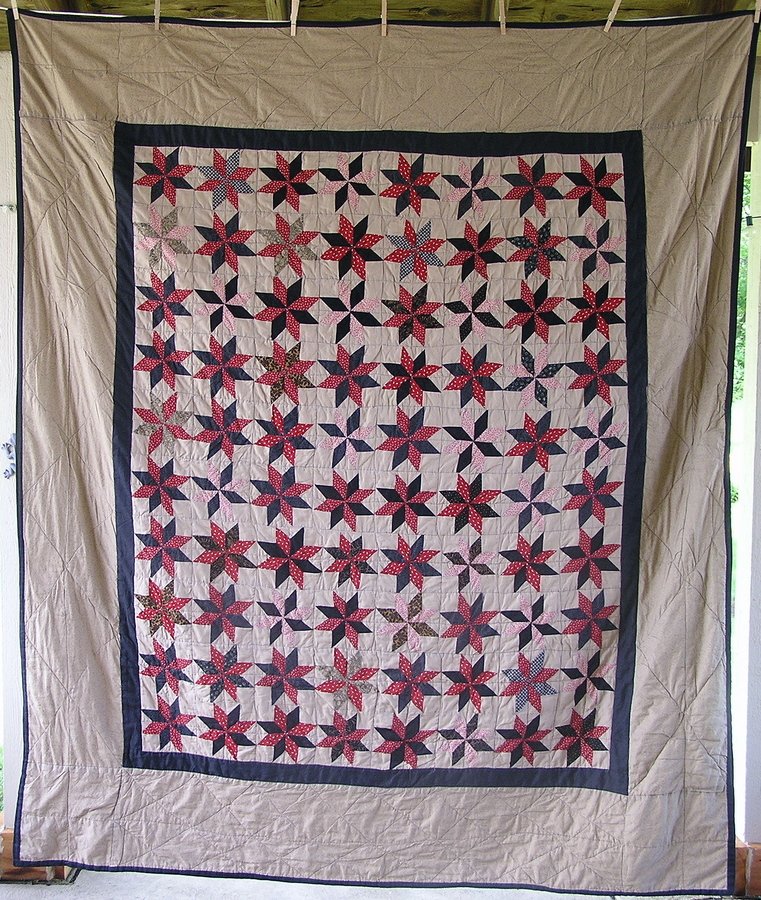 | Design Source - Description | I saw a picture of an antique LeMoyne Star and decided to learn how to piece star points. I made lots of mistakes that I call "learning opportunities." |