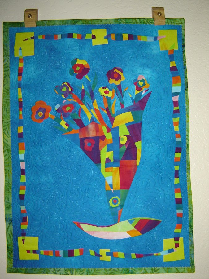 | Design Source - Description | Created in a class taught by Laura Wasilowski in Tucson, AZ, 2005. It started out as a geometric abstract but somehow it morphed into a flower arrangement! |