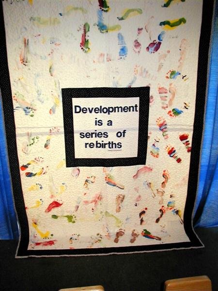 willsew4ucom JMS Graduation quilt - Our daughter and friends were graduating from Kindergarden at the Montessori school and I wanted to make a wall hanging that would leave a memoto from all the children for the school. I worked with the students in painting their feet and letting them walk across the fabric to make a unique foot print. Then I found the Marie Montessori saying, "Development is a series of rebirths" and embroidered that for the center of the wall hanging. The students had great fun with it and the school loved it.