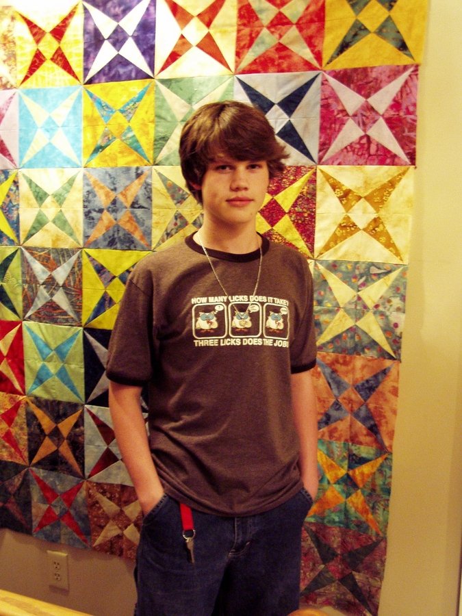 DeboraC Batik Canoe - Not Finished - Pictured is my youngest son in front of my unfinished quilt, which was temporarily hanging in the hallway.
