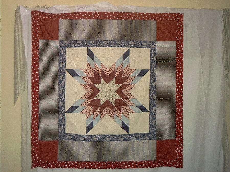 das0421 Mary Jean's Liberty Star - This lap quilt was made for my deceased mother's best friend, Mary Jean Douthitt, in honor of her 83rd birthday. Mary Jean loves all things Americana. In fact, she drives her little White Rabbit around town with a U.S. flag flying. Yes, she's very active and an inspiration to everyone who knows her. In the four corners, I used silk thread to embroider the year of her birth in one corner, the current year in another, her monogram in another corner and mine in the last. She's been our family friend since I was born and became friends with my mother in/around 1933. I love her a lot.