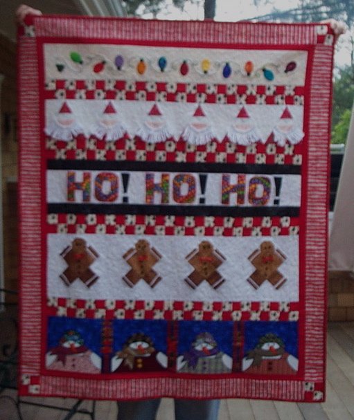 VickiC Round Robin Christmas Quilt - This was done as a round robin in a mini quilt group. I started with the Gingerbread men, and the other strips were added by the other members of the group, then I added the strips of small squares and put the quilt together.