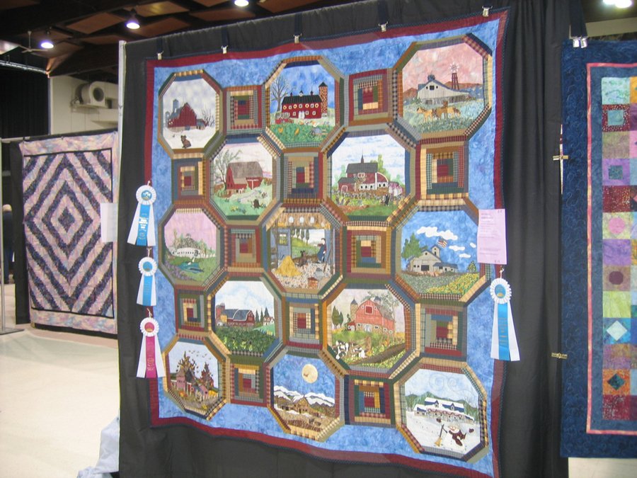 NoraWolfe Barns through the Seasons - There are 13 blocks, each depicting a barn from around the United States. Each barn has animals but only one has a human. The center block with the human shows the only interior barn view. This quilt is heavily embellished with silk ribbon embroidery. Each block is hand quilted, the entire quilt was hand pieced and hand appliqued. It took 5 years to finish.