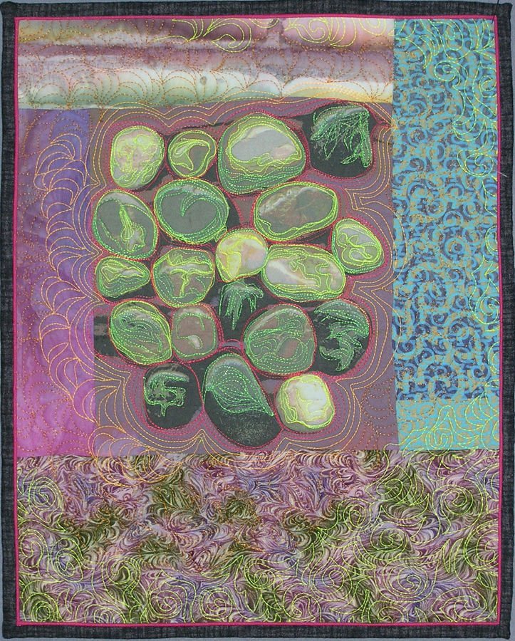 | Design Source - Description | Photo of "stones" with software "neonoize" manipulation. Printed on cotton fabric. Machine embroidered and quilted with Superior tri-lobal poly thread. |
