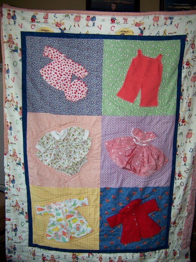 sandramfindling Childhood Memories - I was inspired when I visited The Keepsake Quilt Store in N.H. three years ago. I bought a few of the border fabrics in hopes to find my daughter's doll clothes her grandmother Findling made for her. Once I found them I knew what to do. I started by hand applique with embroidery floss in the blanket stitch on 30's fat quarters I had in my stash. The quit will be for my daughter when finished for her 46th birthday. Not having any grand daughters I hope one day my grandson Peter will have a daughter one day to hand this down to.