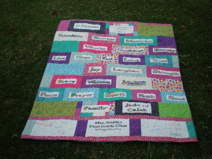 Melissa Words of Encouragement - My daughters have gone to school with a boy named Caleb and have had him in class the last three years. His Mom, Crystal, has been fighting cancer for all three of these years so we worked with the first grade class and made his mom a comfort quilt. She absolutely adores it and was very surprised by the class effort!!!