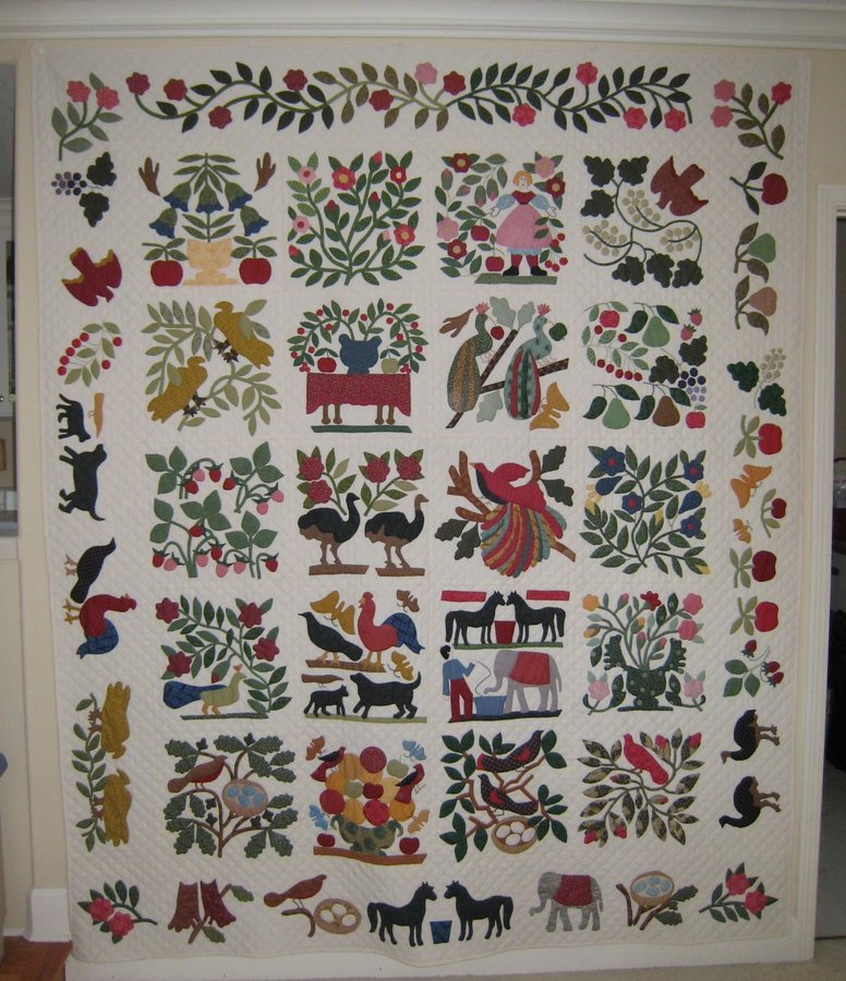 AtPiece Folk Art - Each block was scanned on the computer and enlarged to 16" squares. It is as about exact a replica as one could probably make. I took applique "kits" on all my travels and as I look at it today I remember all the places I went while working on each square. I usually have my quilts machine quilted but this one was a one of kind so I had it handquilted.