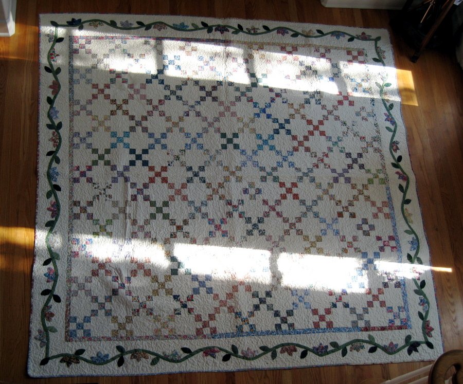 AtPiece Liberty Nine Patch - I have used my collection of Liberty of London fabrics for this quilt. I used a basic nine patch pattern and added hand applique flowers for the border also using my fabrics. I have few left. I have made small zipper bags each so I can have them forever.