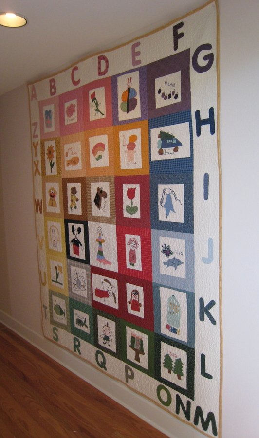 AtPiece My "Kid's" Work - I had designed and made (with the help of some volunteers) five quilts to auction off at my daughter's school. I scanned children's drawings (some the size of a dime) and enlarged them for the quilts. I thought after doing that why not do one of my own children's drawings. SOOOO I gathered all their old art work (some of those were also the size of a dime) and scanned, enlarged and appliqued them and this quilt is the result. It hangs in my entry and my grandchildren love to touch it and hide behind it.