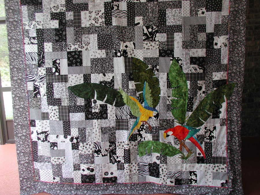 sciofalo Caribbean Nights - My daugther wanted a black and white quilt but with a Caribbean Flair. I used the yellow brick road pattern for my base and appliqued bright color parrots that I found in a magazine. Also added a multicolor pipping between the body of the quilt and the border.