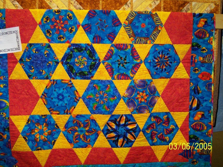 | Design Source - Description | Stack 'n Whack made for my first grandchild, so I hope it is not still in pristine condition.... I hope he is enjoying it! Appliqued fish cut from fabric "swimming" out of border onto pieced part of quilt. |