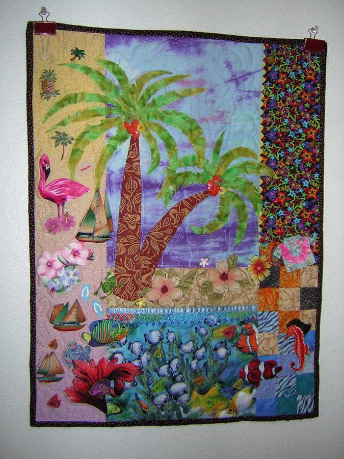 | Design Source - Description | This quilt was made for a TLC Quilters guild challenge. The palm trees have loose fronds & buttons for coconuts, fish & star buttons, all things tropical, even flip-flops! |