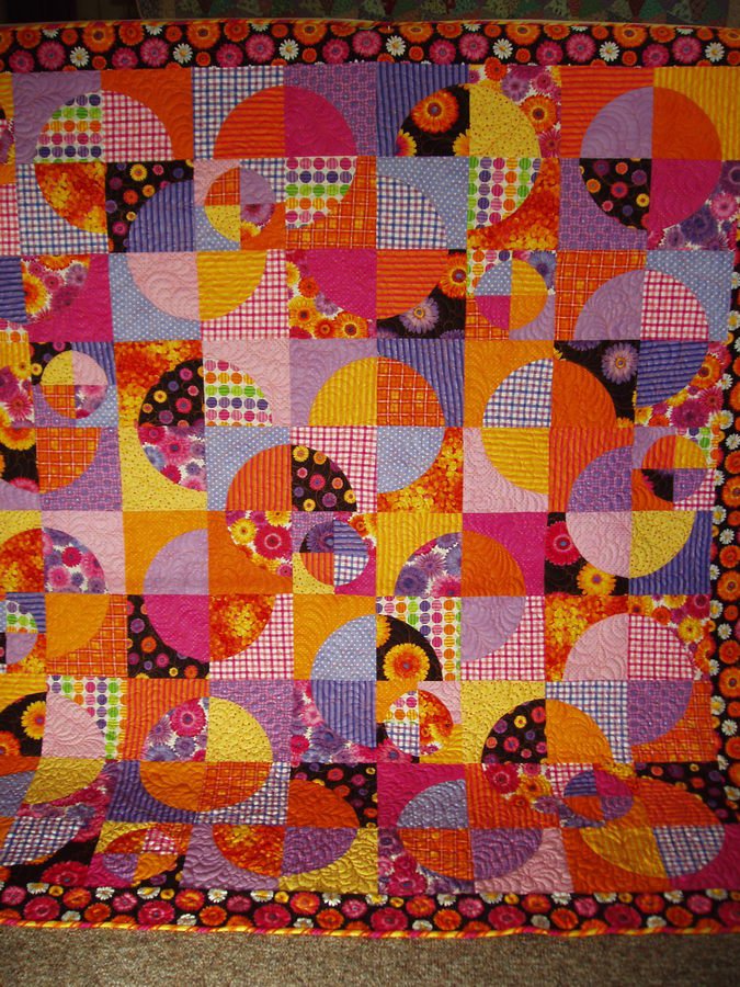 KarenQuiltsNKaboodle Here We Go Round In Circles - A great fat quarter pattern, used 20 FQ's with Elisa's 7" & 3.5" templates. Custom quilted with beautiful 'spineless" feathers in bright orange thread.