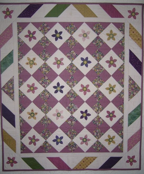 Shutterbug Floral Four Patch - This quilt looks like a four patch on point however it's the applique block that is on point and the whole quilt is pieced in rows