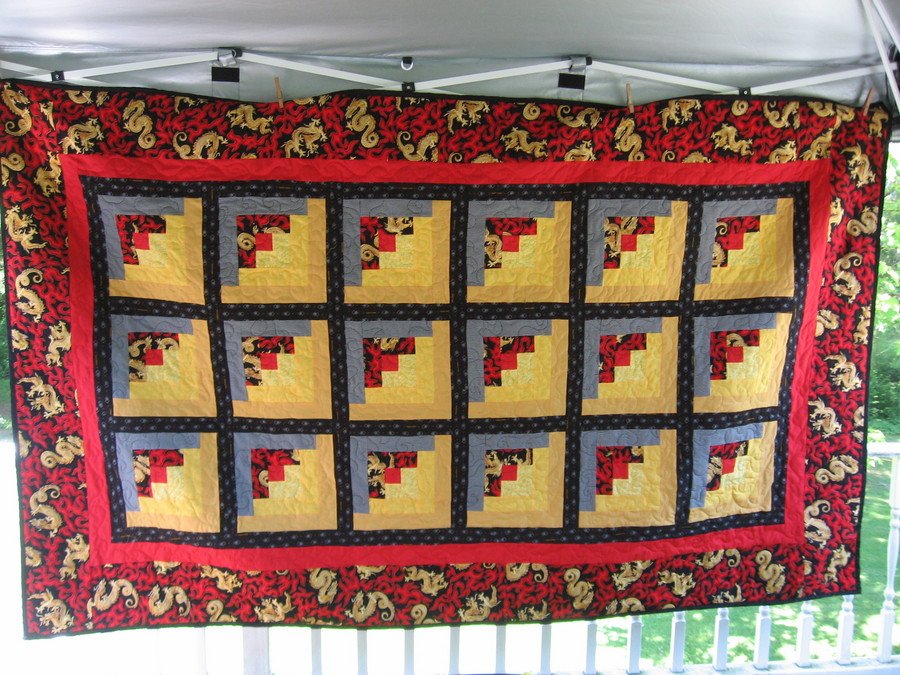 AliceGibsonNY Dragons and Flames for Luke - Quilt Journal – Luke’s Quilt – June 15th, 2007 Today, I finished putting the binding on grandson Luke’s quilt. He likes dragons and fantasy, so it took a while to collect this fabric – mostly from Wal-Mart. The top is done in a Log Cabin pattern, my first, and I used the “Quilt in a Day” book by Eleanor Burns. It was a joy to follow her directions. I sewed it in our motorhome during the winter of 2006-2007. The backing is solid black with a label – To Luke from Mema. I had Linda Denner from Warrensburg, NY machine quilt it. She did a nice job- following the “flames” theme and charged me $110. The quilt size is big.. 62”wide by 102” long.