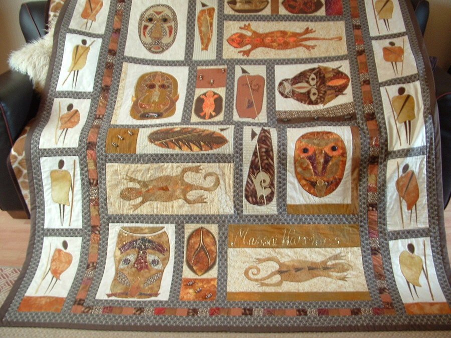 warby Massai Warrior - All my own designs, appliqued and free machine embroidered blocks and panels. Inspiration taken from my trips to Africa. Incorporating my own hand dyed fabrics, and embellished with buttons from my old clothing from the 70's!! An absolute joy to create.