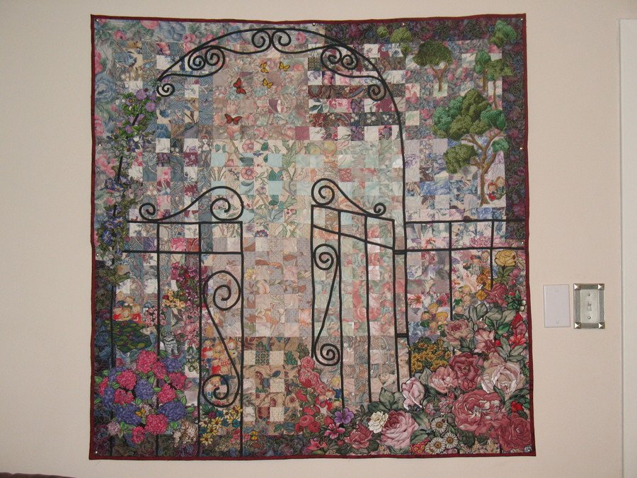 Judith Memories of Mother's Garden - A profusion of flowers and ironwork in the garden were my mother's pride. Since her passing, only the ironwork remains in the garden. I have sewn in family groups from her children, grandchildren, great grandchildren and great-great grandchildren. The children especially love to find the family groups and can't wait when there is a new member to add.