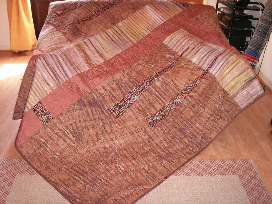 warby Walkin Together - A quilt to comemorate the wedding of my daughter, Rachel. Constructed from my own hand dyed fabrics, with a flash of commercial fabric given to me by a dear friend. A labour of love for her and her future husband, Andrew. One of those creations you have made,when you are glad you giving it to the one you love, because really you'd love to keep it yourself!!