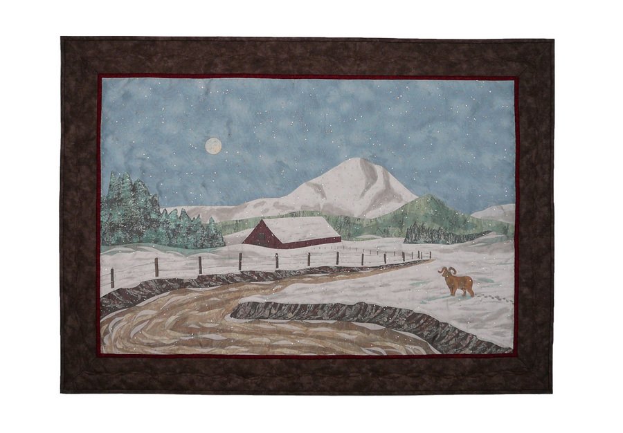 | Design Source - Description | This pictorial quilt was inspired by an oil painting I did in 1980. To get the feeling of snowfall, I put a layer of sparkle organza over the top of the fused and painted picture before I added the borders. |