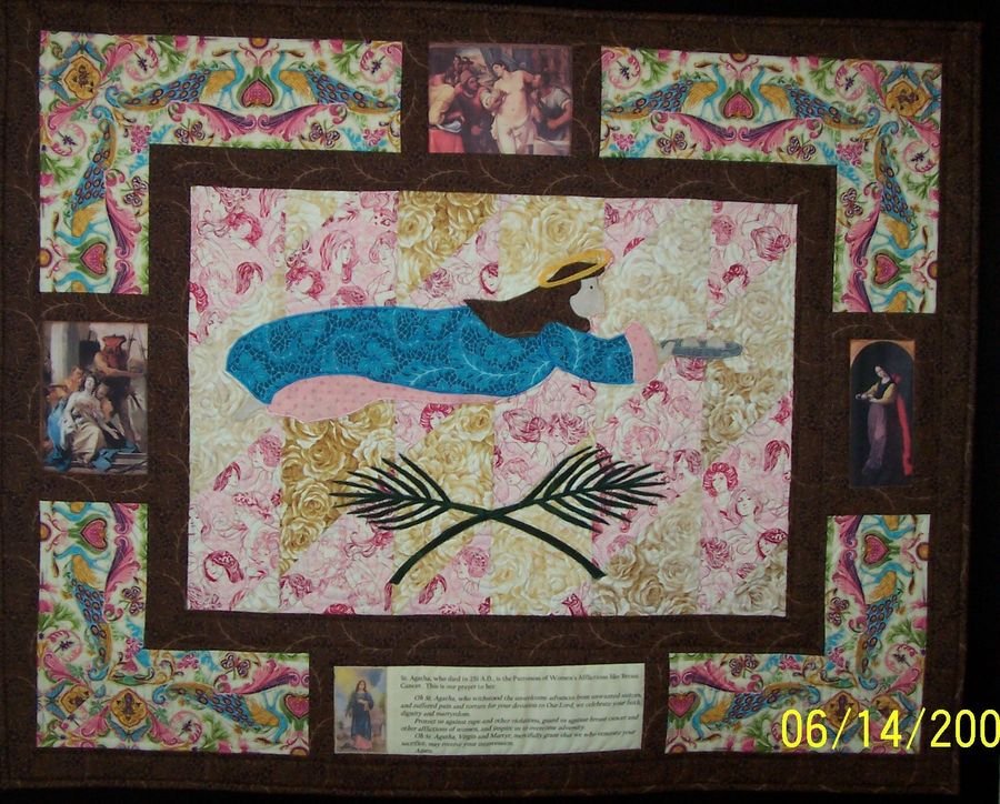DMENG Hailing Saint Agatha - Depicts Saint Agatha - Patron saint for Breast Cancer both in applique and by printing images from paintings in the border. Designed for both Robert Kaufman Fabric "Life, Love & Hope" contest and local quilt guild challenge. Original is currently travelling as part of "Life, Love & Hope" exhibit. A second similar quilt is currently for sale on behalf of the Wellness Community of SW Florida.