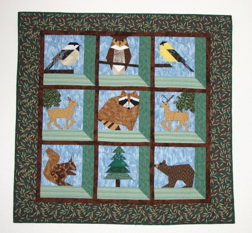 cronequilter Rocky & Friends - The raccoon that climbs up on my daughter's deck has been christened "Rocky." Other animals that frequent her yard in the mountains of North Idaho are bear, deer, and birds.