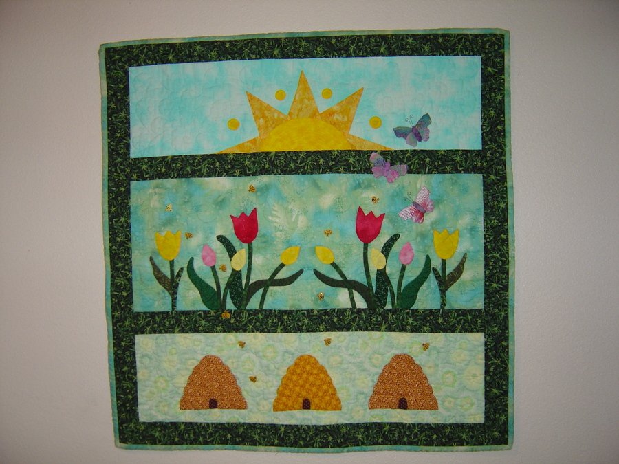 RoseH Bill's Bees & Tulips - I used applique designs from Life in the Country With Country Threads to depict my husband's favorite childhood memory of watching bees buzz in and out of tulips.