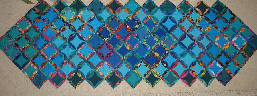 Kriss Meant to be a tablecloth - Tried to use my most colorful patterned fabrics on one side and solids from green to blue onthe reverse.